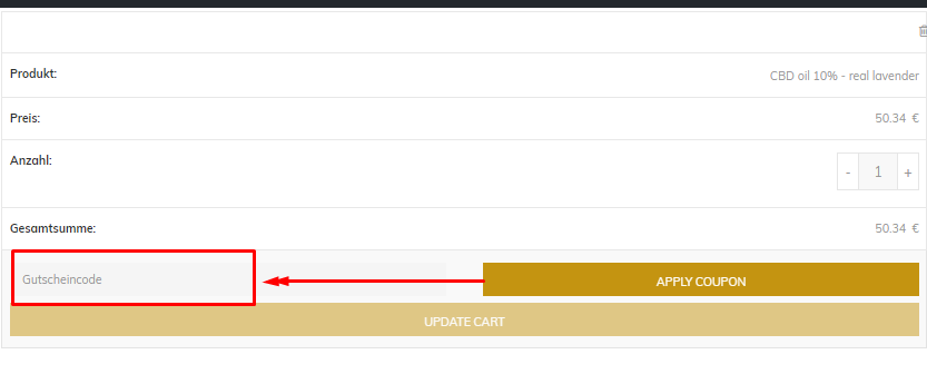 Stöbern Sie zunächst in der Kategoriemischung und legen Sie Ihre gewünschten Produkte in den Warenkorb. Ein Gutscheincode wird direkt im Warenkorb in das Feld ‘Gutscheincode’ eingegeben und mit Klick auf “Gutschein einlösen” gutgeschrieben. Wenn der Rabatt abgezogen wurde, können Sie Ihre Bestellung abschließen und die Ware zu einem reduzierten Preis erhalten.