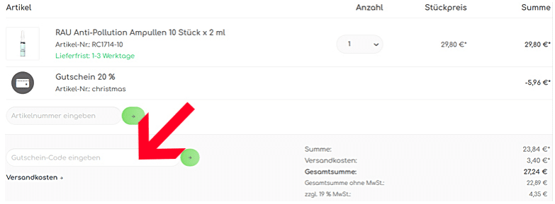 Wählen Sie Ihre Pflegeprodukte aus und legen Sie sie in den Warenkorb, den Sie dann aufrufen. Nun öffnet sich auf der rechten Seite ein Fenster, in dem Sie auf Warenkorb bearbeiten klicken. Nun erscheint Ihre Artikelübersicht und darunter können Sie Ihren Gutscheincode eingeben. Klicken Sie auf den grünen Pfeil rechts und Ihr Rabatt wird von der Gesamtsumme abgezogen.