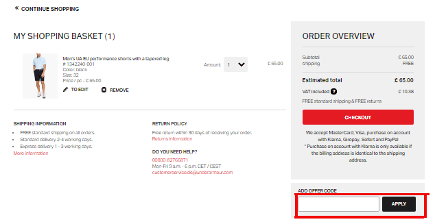 • Klicken Sie im nächsten Schritt auf den Warenkorb, geben Sie den Under Armour-Rabattcode in das Feld für den Angebotscode ein und klicken Sie auf Übernehmen.